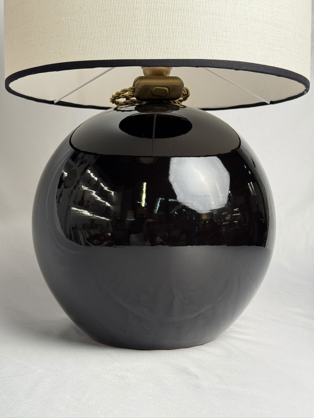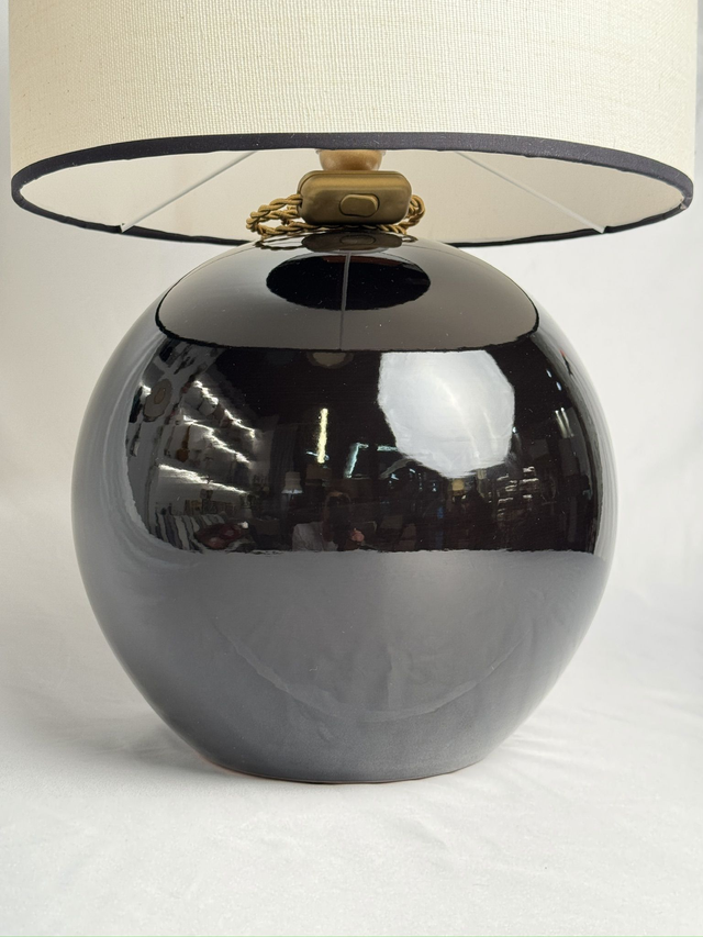 Lampara cerámica con forma de bola grande en color negro, cable de seda y portalámparas dorados y pantalla de lino color blanco roto rematada con cinta negra. Se venden también el pie y la pantalla por separado (consultar). Medida del pie 30 de diametro x 32 de altura. Medida pantalla 35 diametro x 30 de altura.2
