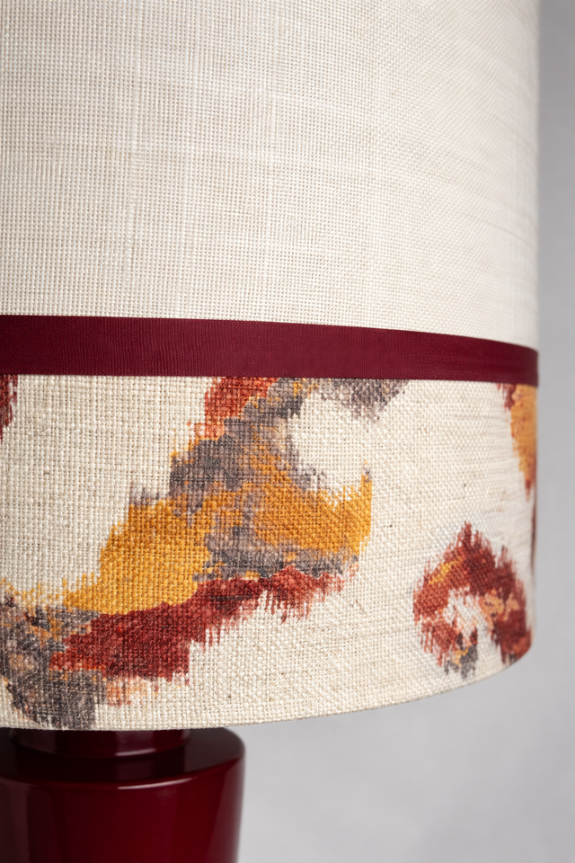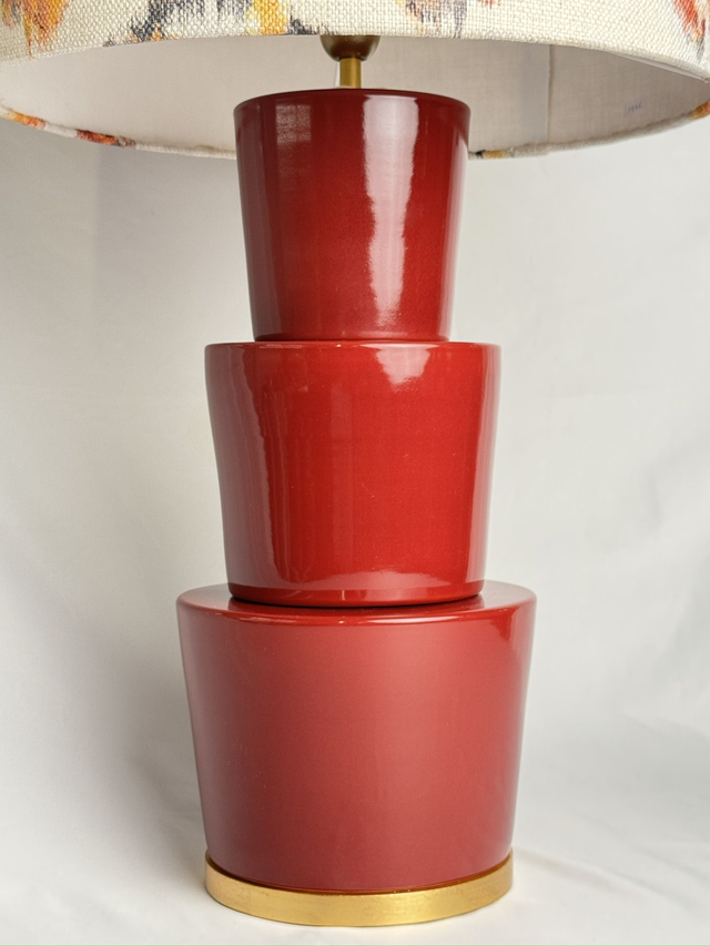 Lampara de cerámica con base dorada recta, cable de seda y portalámparas dorados y pantalla. Se vende el pie y la pantalla por separado (consultar). Pantalla en tela de lino color crema con aplicación de tela estampada y cinta burdeos. El pié mide 48 de altura x 20 de diámetro y la pantalla 40 de diámetro x 45 de altura.