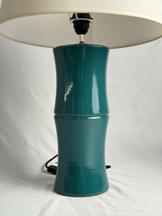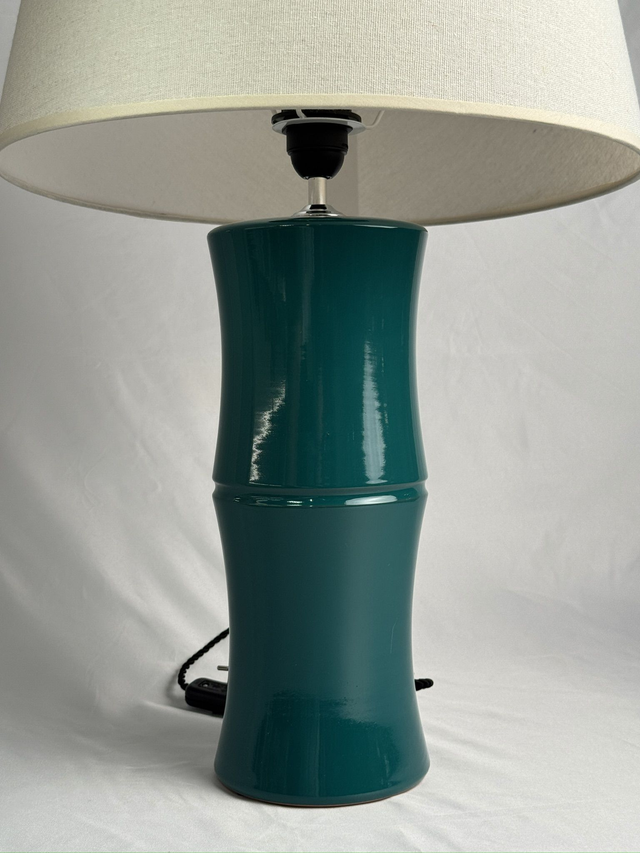 Lampara de cerámica color verde musgo con cable de seda y portalámpara negros y pantalla de algodon color lino natural. Se venden tambien por separado pie y pantalla (consultar). El pie simula una rama de bambu y mide 37 de altura x 15 de diámetro. La pantalla cónica mide 38 abajo y 28 arriba y 23 de alto.