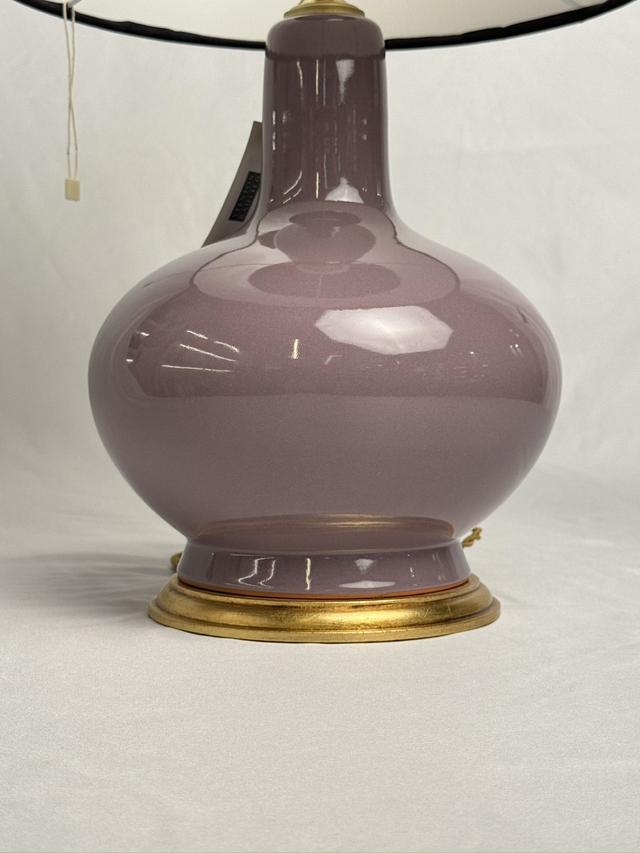 Lampara de cerámica color malva con base moldura clásica dorada , cable de seda y portalámpara dorados y pantalla color crema con remate de cinta negra. Tambien se venden el pie y la pantalla por separado (consultar). Medida del pié 30 de altura x 25 de diámetro y la pantalla 30 de diametro x 20 de altura