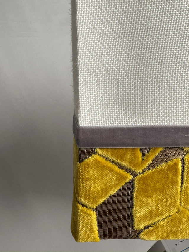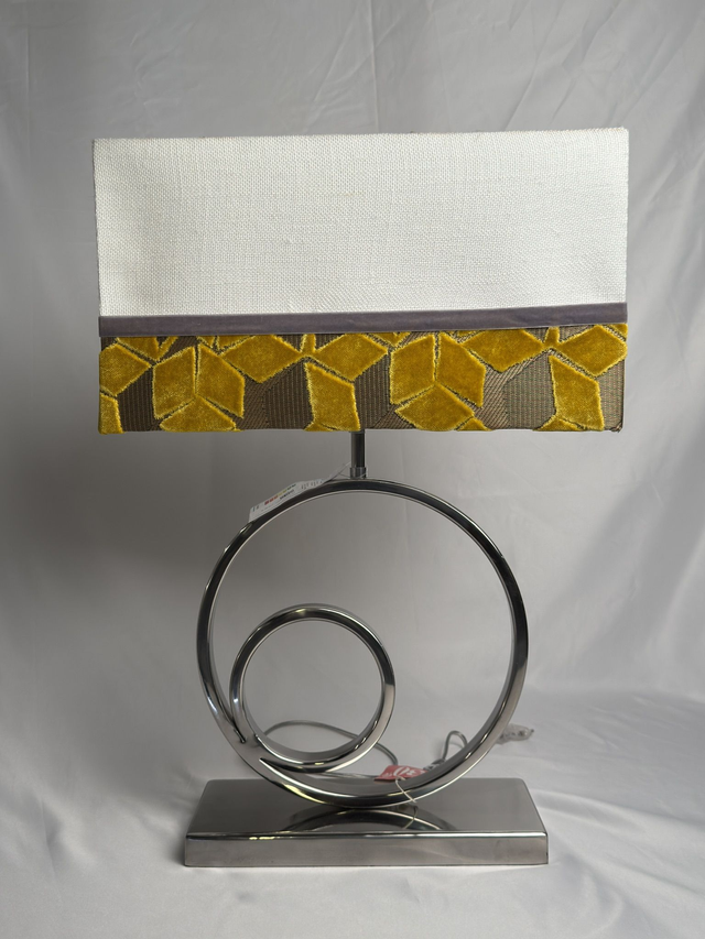 Lampara metálica con diseño circular. Pantalla de lino blanco roto con aplicacion de tela en terciopelo labrado color mostaza y cinta de terciopelo gris. Tambien se venden por separado tanto el pie como la pantalla. Medida del pié 30 de ancho x 37 de altura. Pantalla rectangular de 40 de ancho x 26 de fondo x 22 de altura