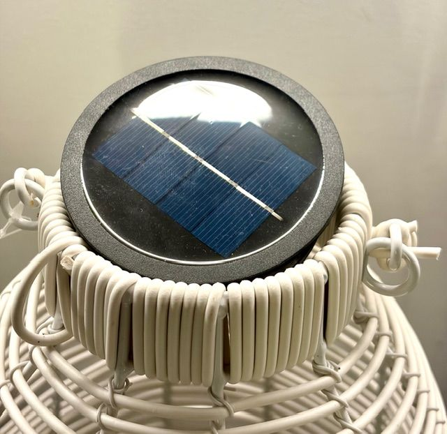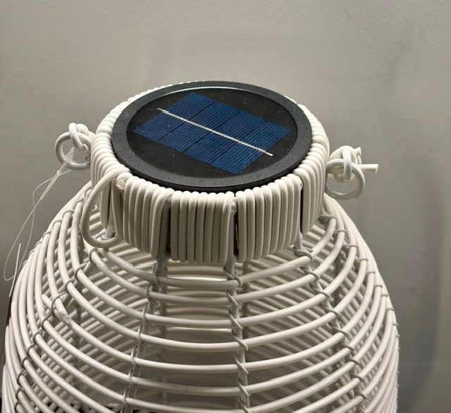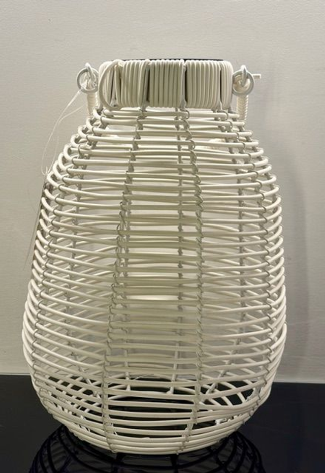 LAMPARA SOLAR RATAN SINTETICO PARA EXTERIOR. SE PUEDE MOJAR. LA PARTE SUPERIOR SE PUEDE RETIRAR MANUALMENTE. COLOR BLANCO. MEDIDA 30 ALTURA X 20 DIAMETRO